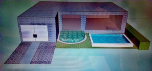 Este es el modelo de una casa con piscina y un jardin.Este modelo fue realizado en la aplicacion sketchUp, Es una casa sencilla la cual ocuparemos para representar una alarma de incendio esta alarma